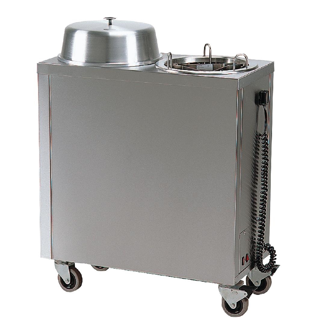 Description : Mobile heated plate dispenser with lid constructed from stainless steel.